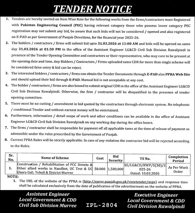 Buildings, Construction, Engineering, Repair & Maintenance, Roads, Water Supply Scheme / Drains / Sewerage