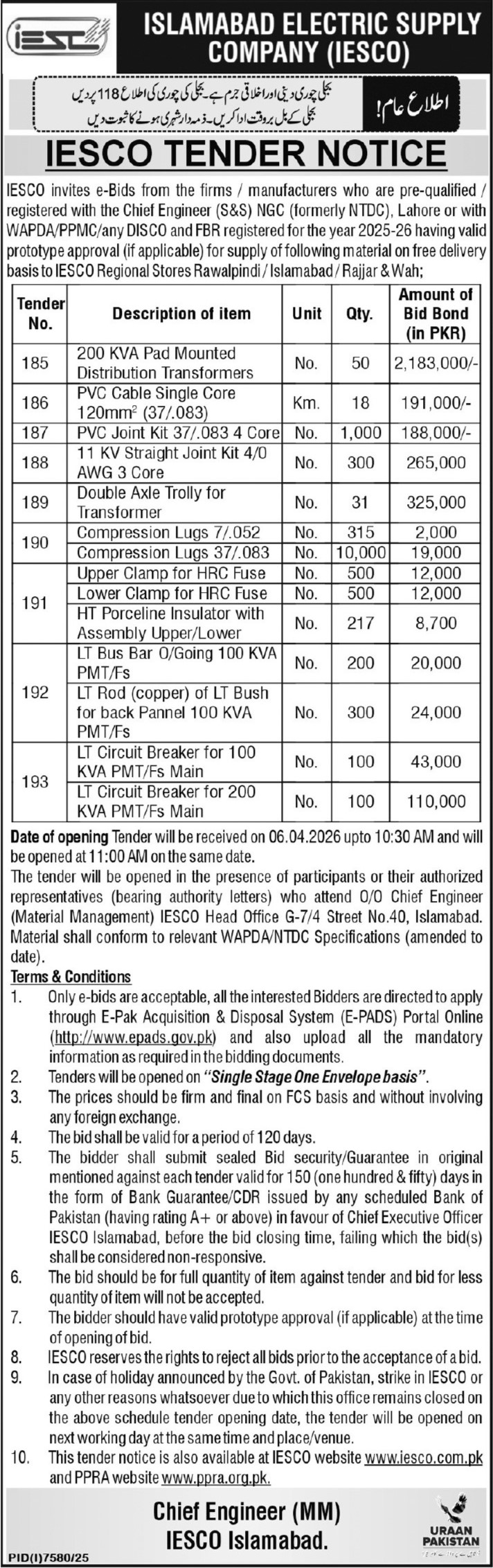 Cables, Electrical, Electronics, Energy, General Order Supply, Machinery, Mechanical, Steel, WAPDA