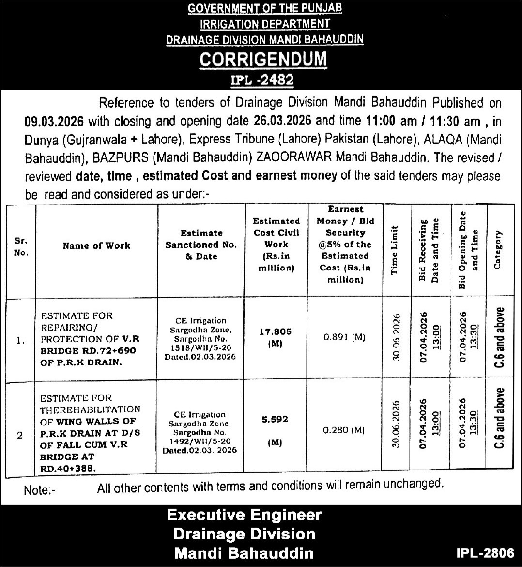 Buildings, Construction, Corrigendum/Addendum , Engineering, General Order Supply, Irrigation, Repair & Maintenance, Water Supply Scheme / Drains / Sewerage