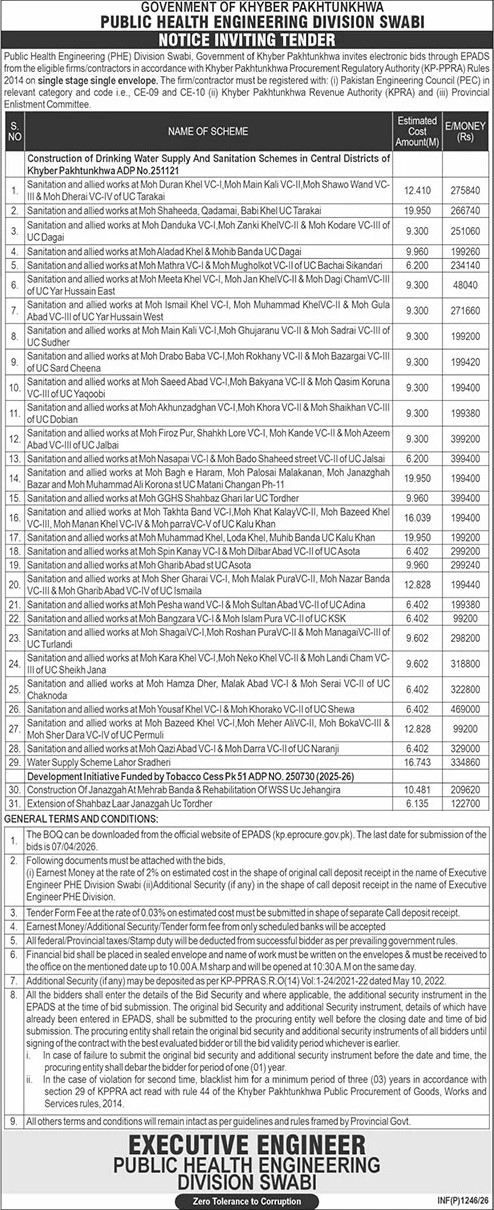 Buildings, Construction, Energy, Engineering, Pumps, Repair & Maintenance, Roads, Tubewells, Water Supply Scheme / Drains / Sewerage