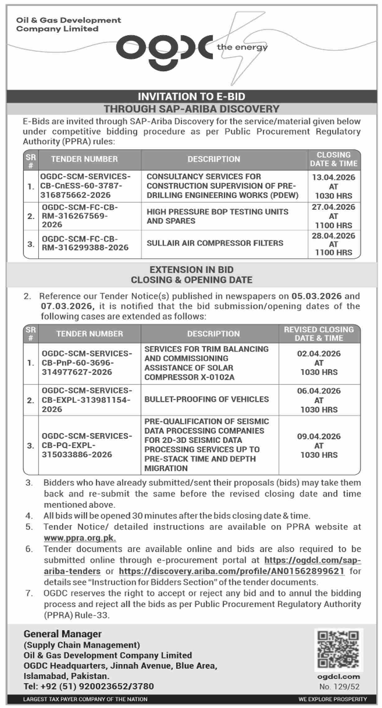 Auto Parts, Automobiles/Vehicles, Buildings, Construction, Consultancy, Engineering, Machinery, Mechanical, OGDCL, OGDCL, Repair & Maintenance, Roads, Services Required, Transportation, Water Supply Scheme / Drains / Sewerage