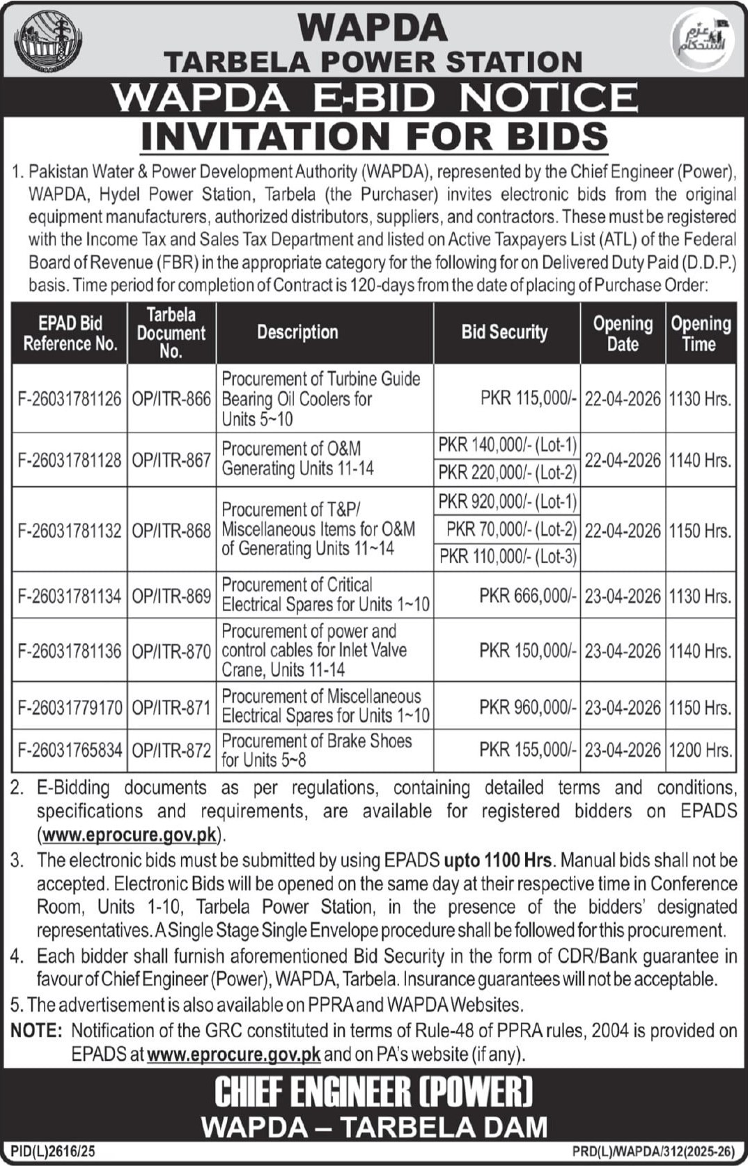 Auto Parts, Automobiles/Vehicles, Electrical, Electronics, General Order Supply, Machinery, Mechanical, WAPDA