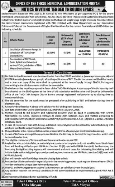 Buildings, Construction, Energy, Engineering, Pumps, Repair & Maintenance, Roads, Tubewells, Water Supply Scheme / Drains / Sewerage
