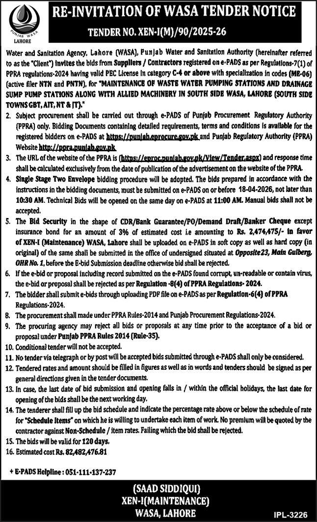 Buildings, Construction, Engineering, LDA, Pumps, Repair & Maintenance, Roads, Tubewells, WASA, Water Supply Scheme / Drains / Sewerage