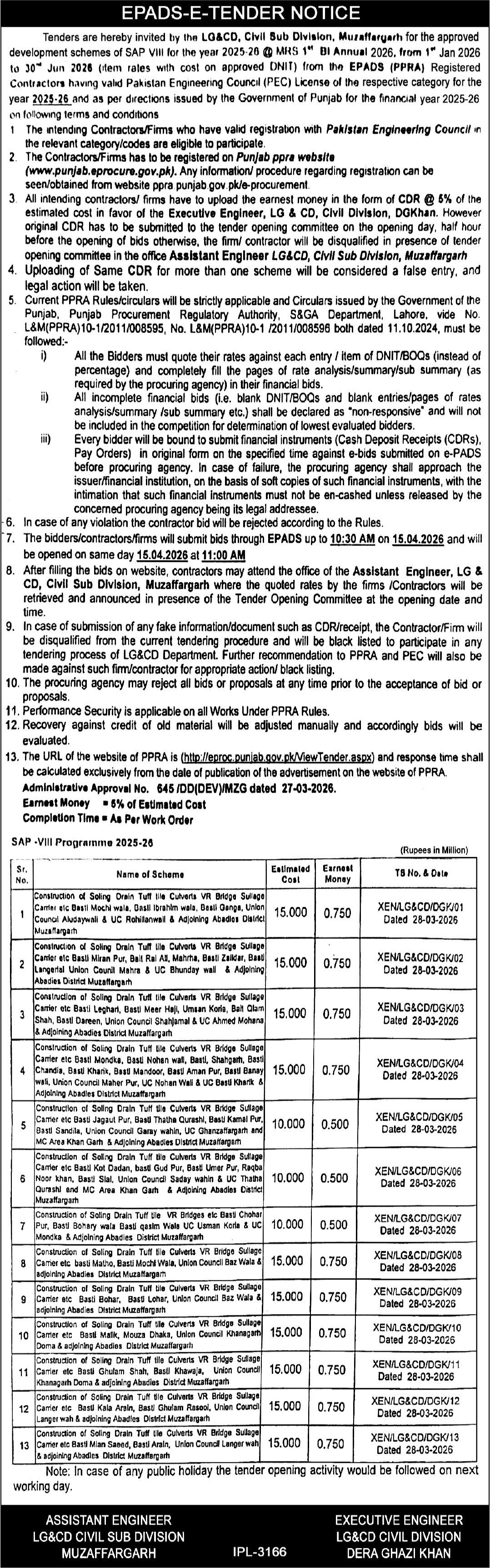 Bridges, Buildings, Construction, Engineering, Repair & Maintenance, Roads, Streets / Soling, Tiles/Marbles, Water Supply Scheme / Drains / Sewerage