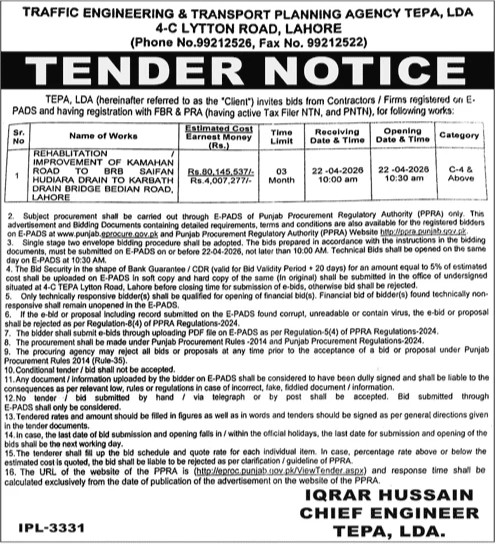 Buildings, Construction, Engineering, LDA, Repair & Maintenance, Roads, Water Supply Scheme / Drains / Sewerage