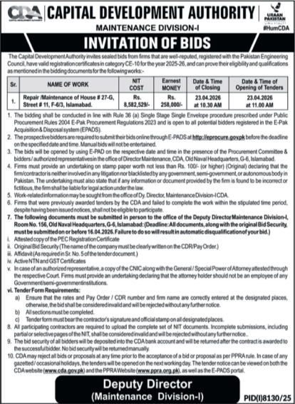 Buildings, Construction, Development Authority, Engineering, Repair & Maintenance, Roads, Water Supply Scheme / Drains / Sewerage