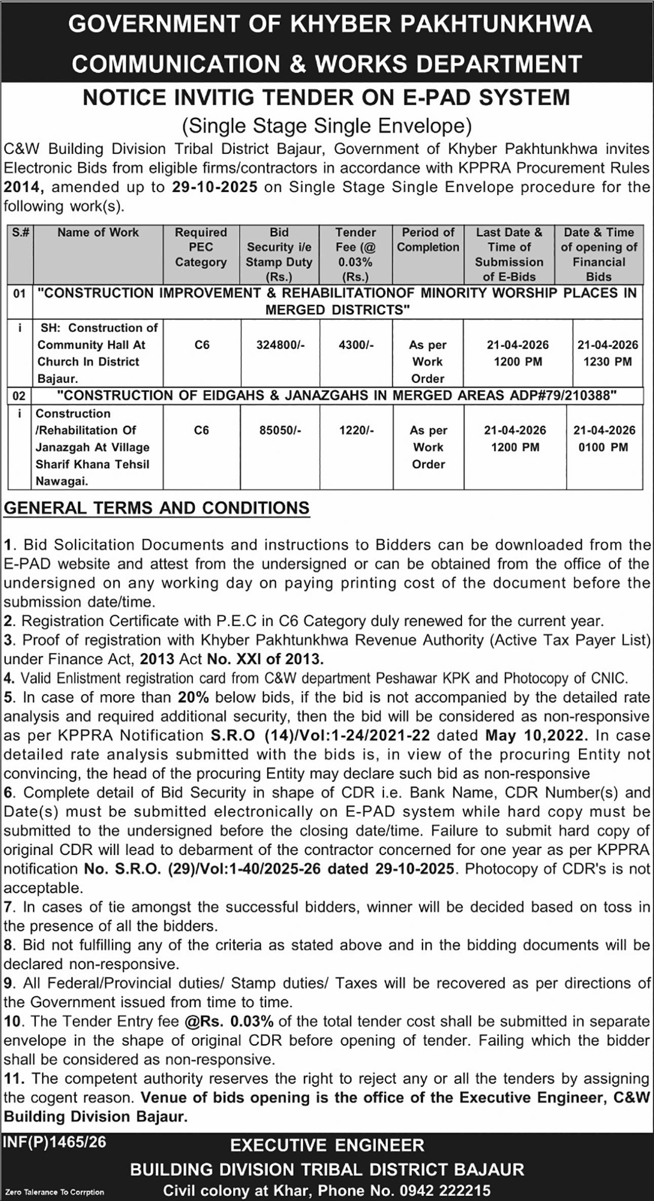 Buildings, Communication & Works, Construction, Engineering, Repair & Maintenance, Roads, Water Supply Scheme / Drains / Sewerage