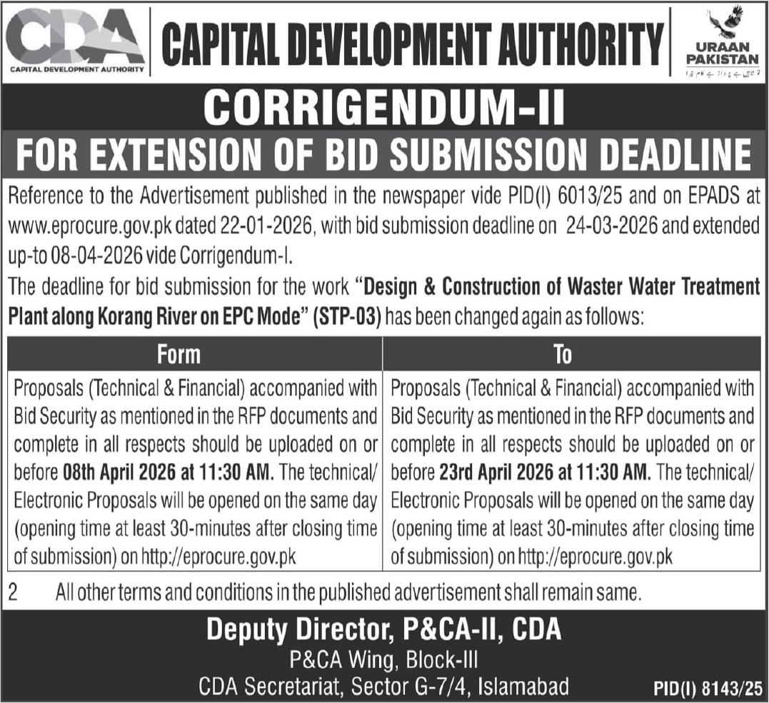 Buildings, Construction, Corrigendum/Addendum , Development Authority, Engineering, Repair & Maintenance, Roads, Water Supply Scheme / Drains / Sewerage