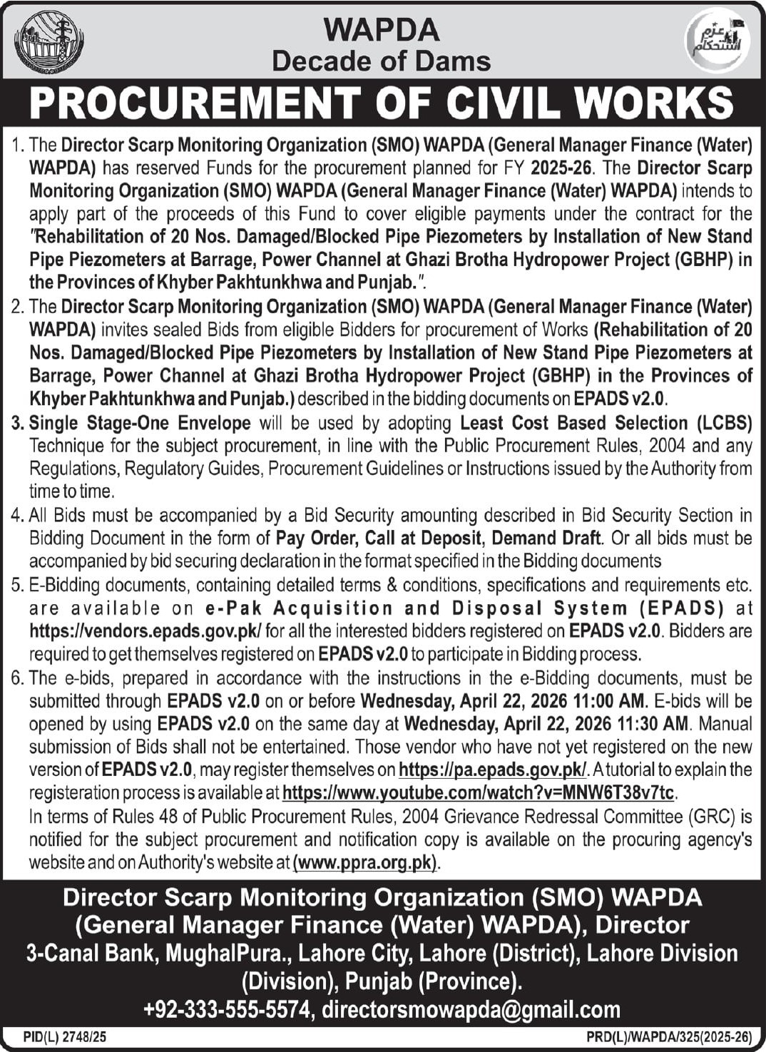 Buildings, Construction, Engineering, Repair & Maintenance, Roads, WAPDA, Water Supply Scheme / Drains / Sewerage