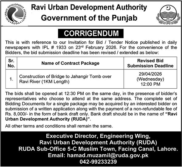 Bridges, Buildings, Construction, Corrigendum/Addendum , Engineering, Repair & Maintenance, Roads, Water Supply Scheme / Drains / Sewerage
